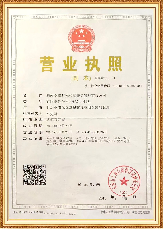 :湖南幸福时光公寓养老管理有限公司创办于2014年6月。公寓开办以来,我们本着以“孝”为先的中华美德和精神,力争为国家、为社会、为家庭分忧解愁,为孝敬、关爱和解决老年朋友的晚年生活,以我们的努力,提供更好更完善的养老服务!